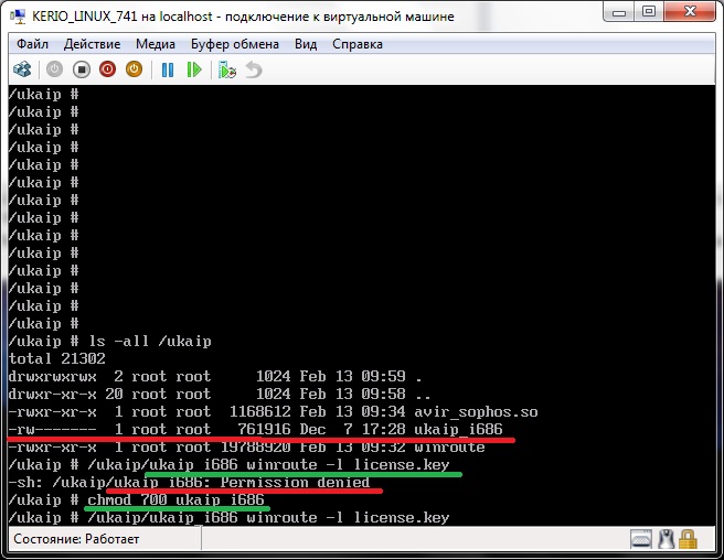 пытаемся применить патч и обнаруживаем, что сделать этого мы не можем - нет прав доступа к файлу патча на выполнение. Предоставим сами себе полный доступ к этому файлу - chmod 700 ukaip_i686 и выполним самую безобидную операцию - сгенерируем лицензию командой /ukaip/ukaip_i686 /ukaip/winroute -l license.ley